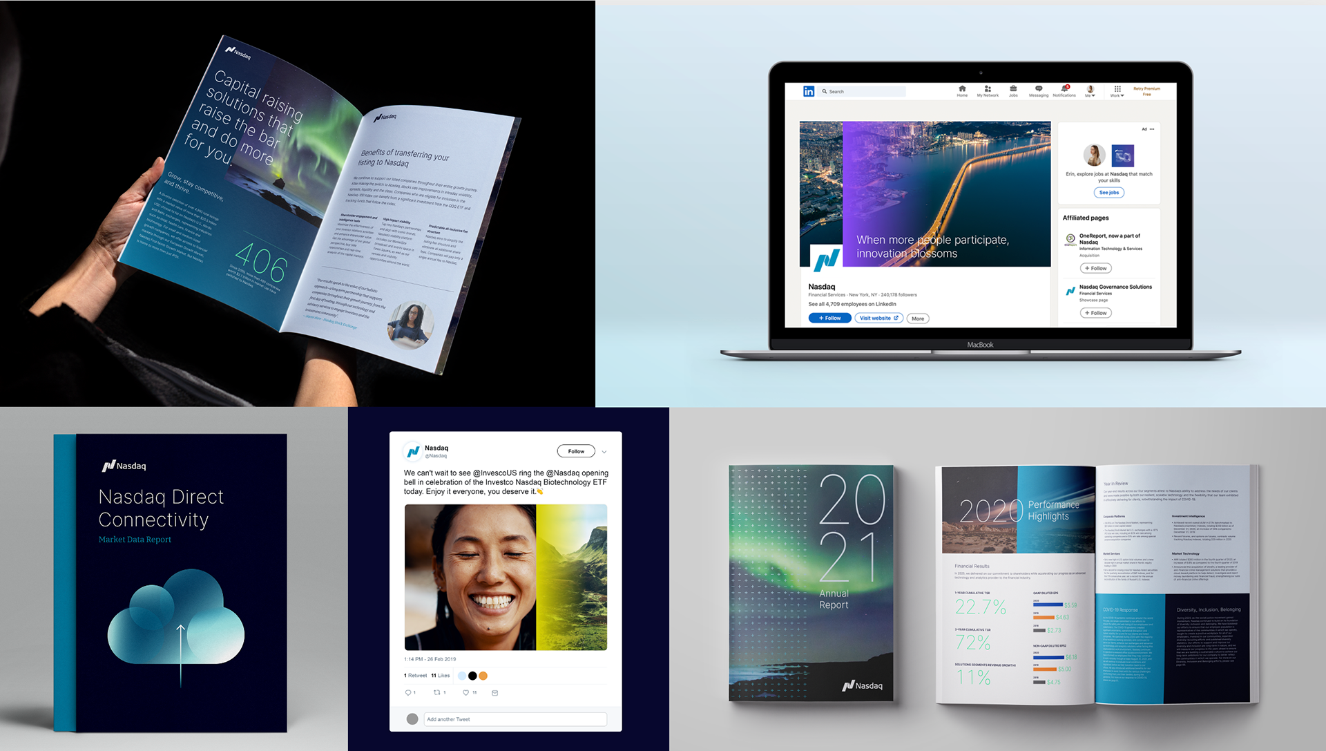 In 2021, I led the internal design team in partnership with our external agency, Landor & Fitch, and further led implementation of a brand refresh for Nasdaq, simplifying and modernizing the visual identity to focus the brand as a forward-looking tech company. We sought to showcase our brand's humanity, global reach and purpose-driven approach to accessing capital and markets. In November of 2022, the refresh received two awards from Transform Magazine, including a Silver for Best Visual Identity from the Financial Services Sector, and a Bronze for Best Implementation of a Brand Development Project.
